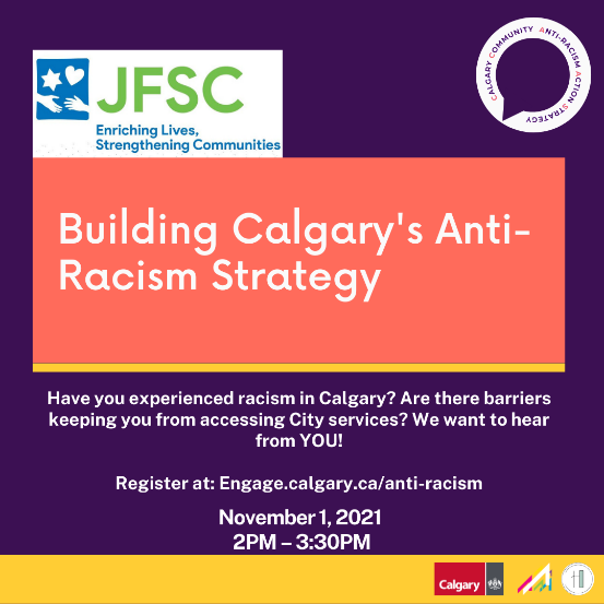 (Calgary, Alberta) Join JFSC, Action Dignity and Habitus Collective in an online discussion and workshop on Monday, November 1, 2021, 2:00pm – 3:30pm to help build a community-based anti-racism strategy for The City of Calgary. The strategy will address systemic racism and discrimination within The City and the wider community.